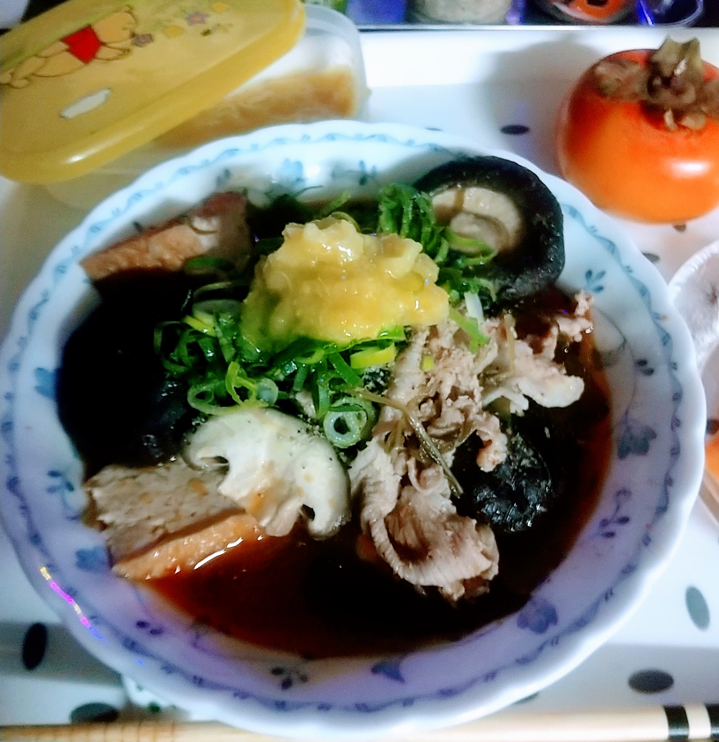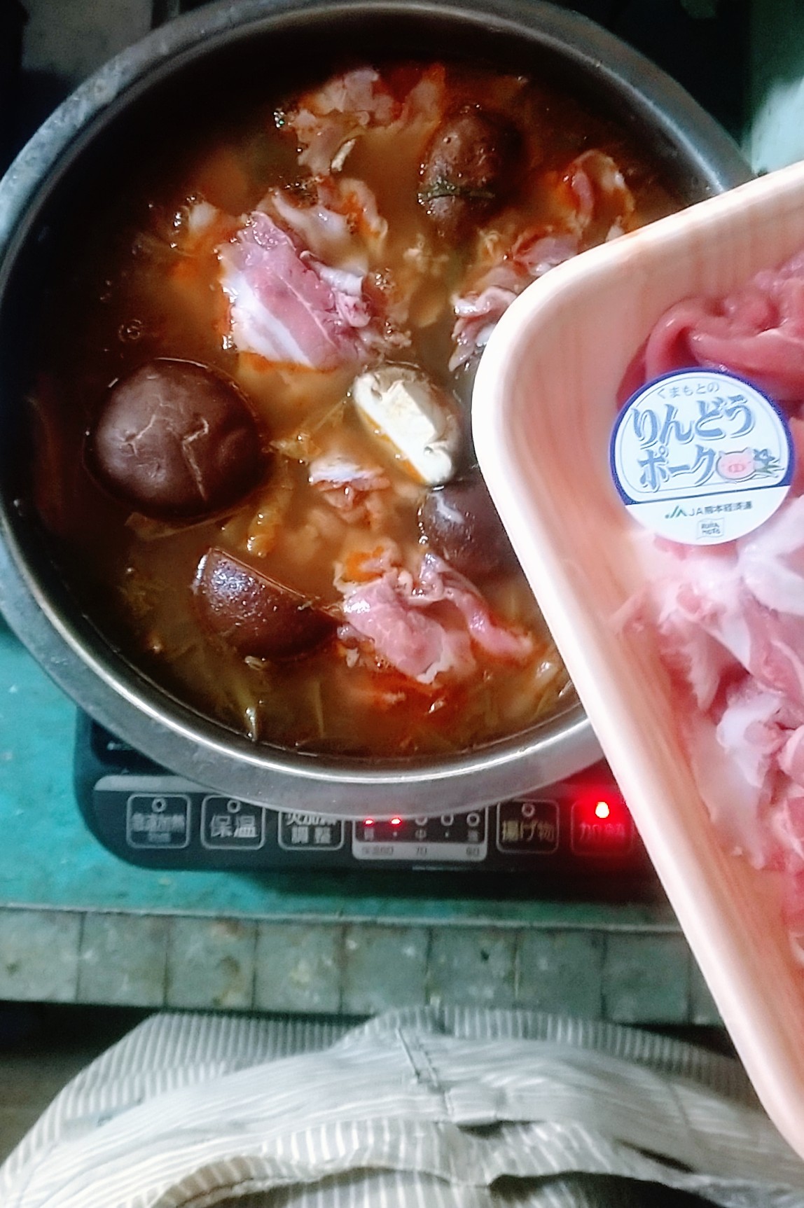 🍲チゲ味噌鍋を作りましたメインは熊本県産りんどう豚🐷さんですどんこ椎茸水菜厚揚げなど入れてトッピングにすだちを皮ごと擦ってかけて食べた😋
