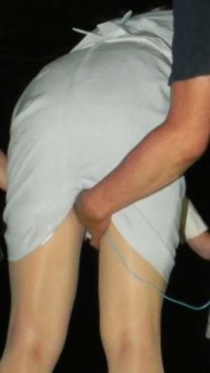 スカート越しにお尻やペ〇クリをモミクチャされスカートは皺クチャに、ローションを垂らしヌルヌルスカートで尻コキさて、そしてスカートのスリットを思い切り左右に引きちぎり… 露になったお尻を更に悪戯されて…