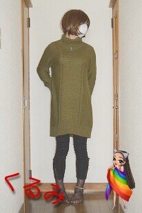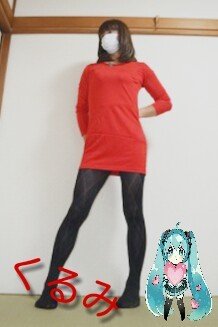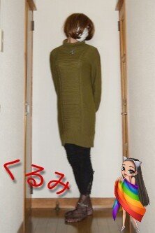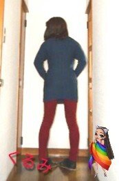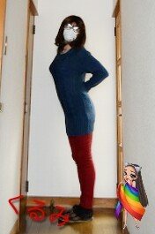 今日は 青いニットのワンピと赤いデニムのスキニーを着てみたよ