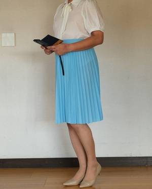 昨日のサックスブルーの上下組み合わせが清楚で素敵です~✨ 極めつけはグレーストッキングのコーディでAkikoの琴線に突き刺さりましたよ~♡