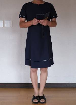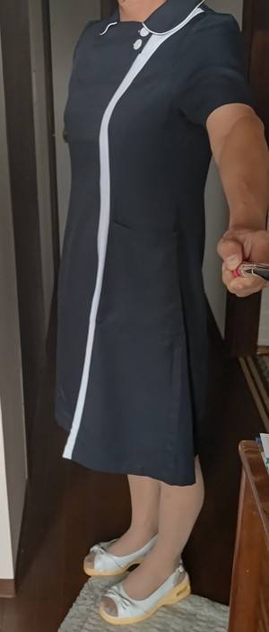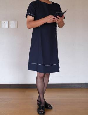 今日は前から持っていた紺のナース服にベージュパンストにしましたよ。