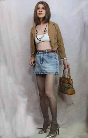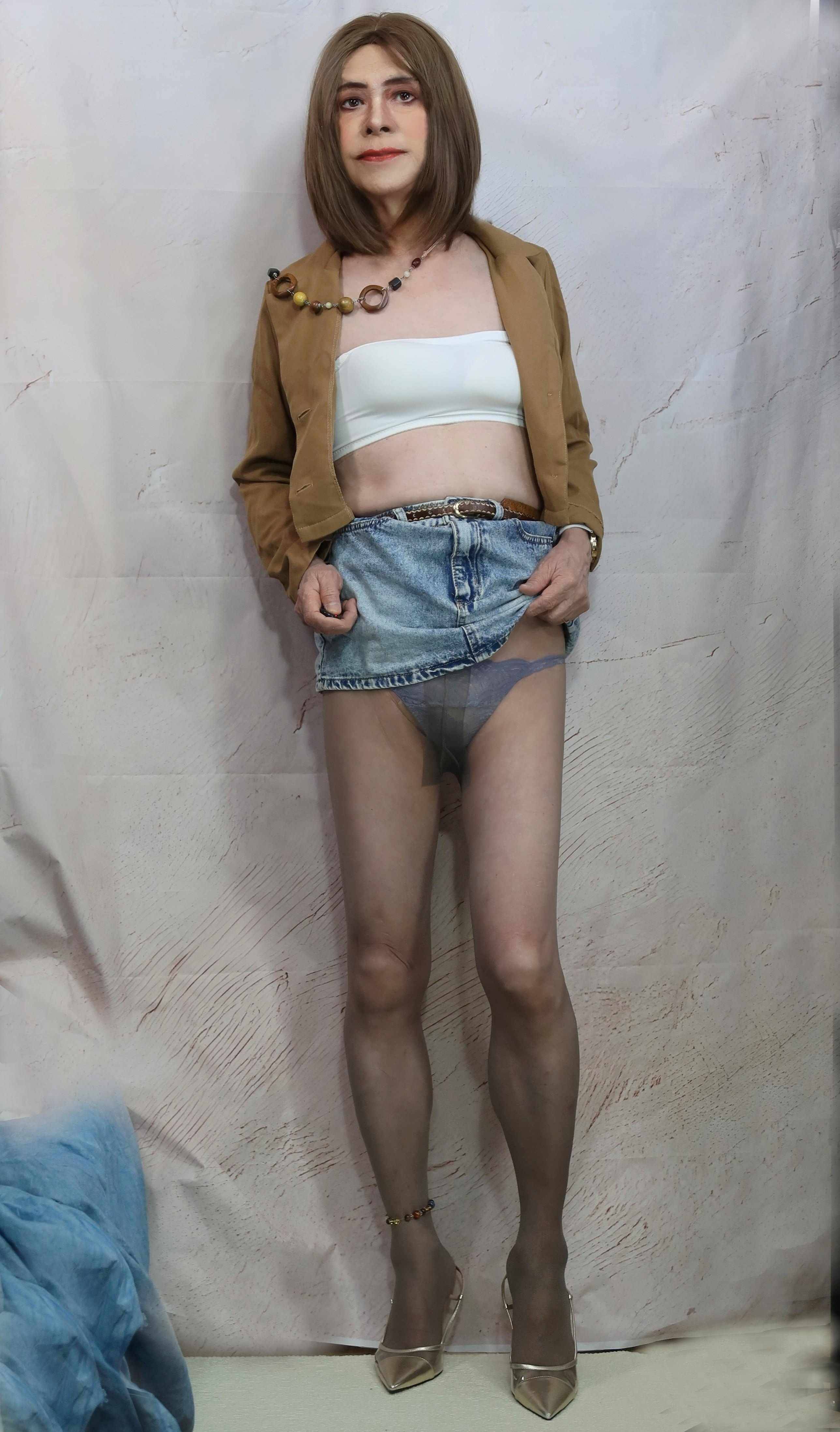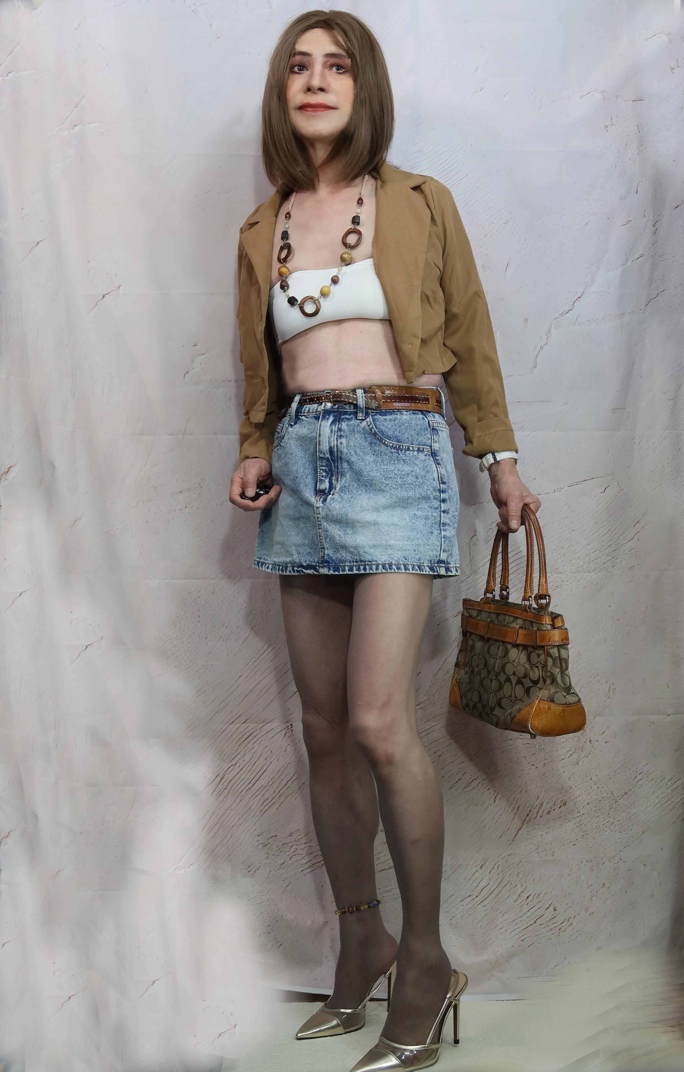 久々にデニムミニ、茶色のジャケットを羽織ってみました。