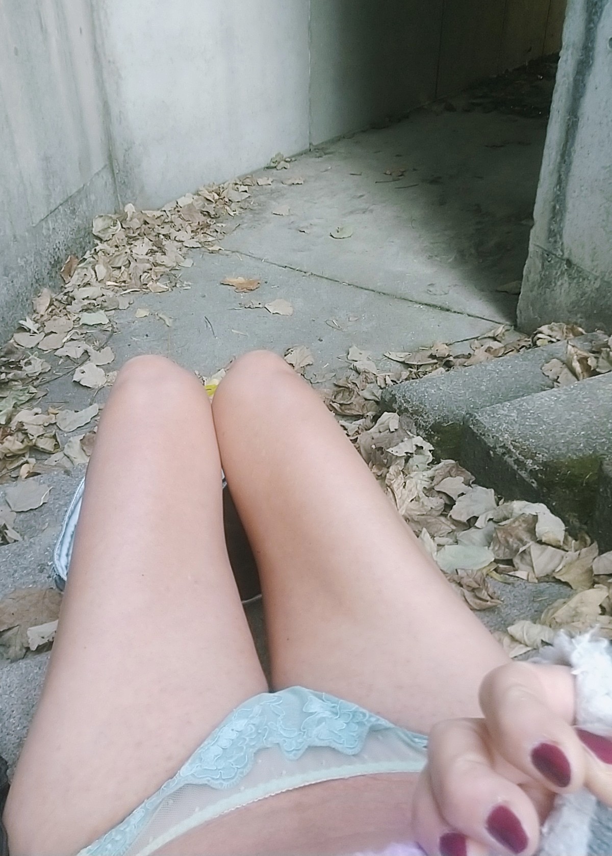 階段で座ってチラ