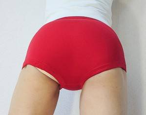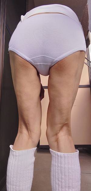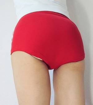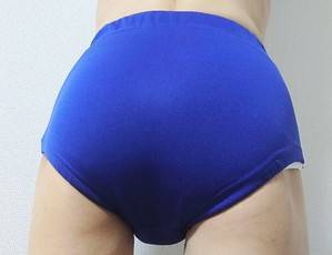 何時もは、ブルマを直穿きですが、撮影の時はパンティーラインを浮き出させる為にパンティーを履きます。画像は、生理用ショーツです。ナプキンも着けています。