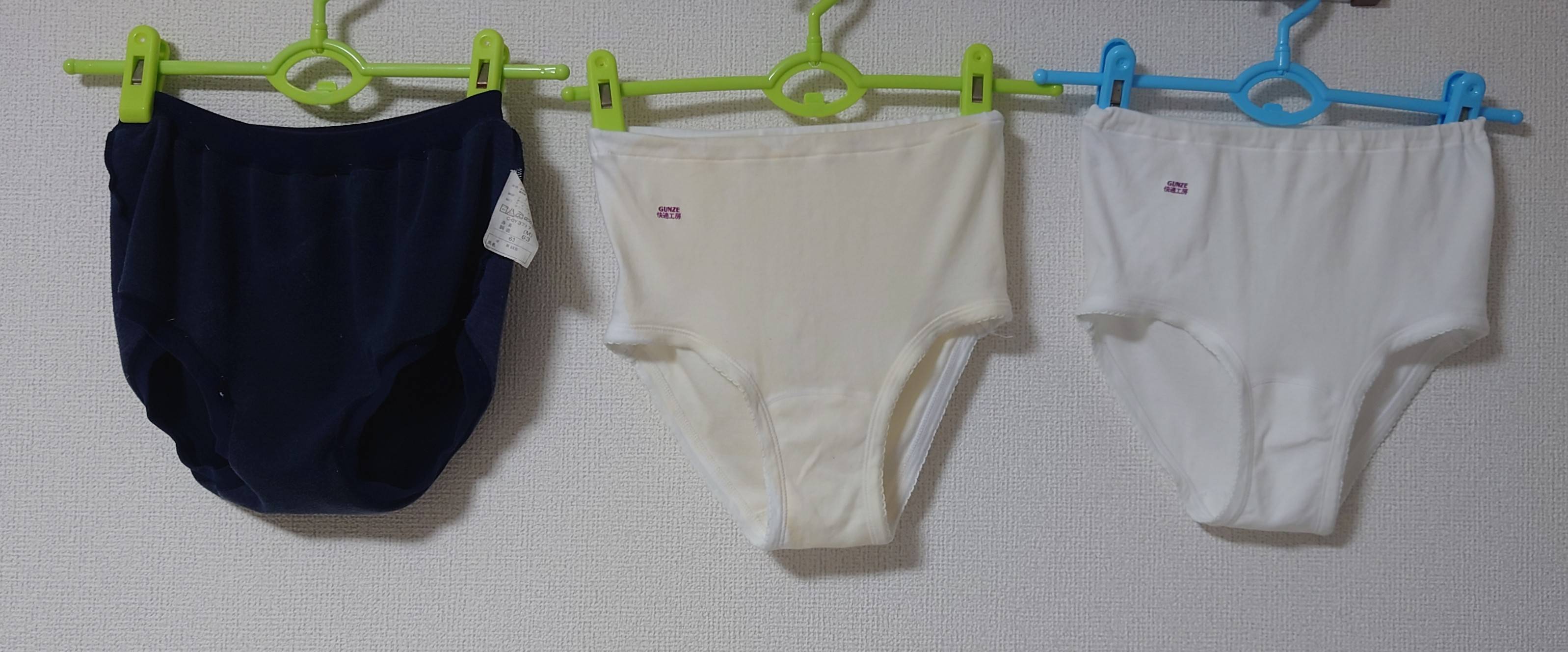 先日買った、GUNZEのショーツ、2着買ったので、1枚をおしっこ漬けにして見ました。ブルマは、おしっこと精子の二刀流です。かけ続けて3日め位です。ブルマは、分かりにくいので、ショーツを比較の為、おしっこ掛けていないショーツと並べて見ました。