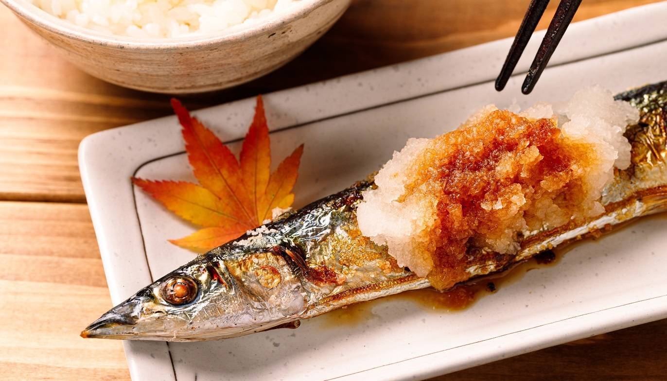 焼きたての秋刀魚に大根おろし、柑橘果汁。