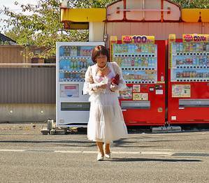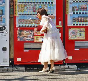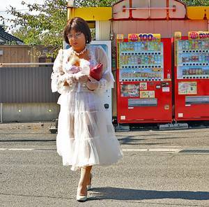 道路沿いの自販機で透け衣装のオカマ姿を通りすがりの車に見てもらって興奮しているの。