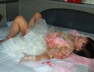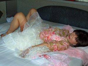 男がスリップを着て、レトロなバックシーム付きのストッキングを身につけてペニスをボッキさせてるなんてとてもステキよ