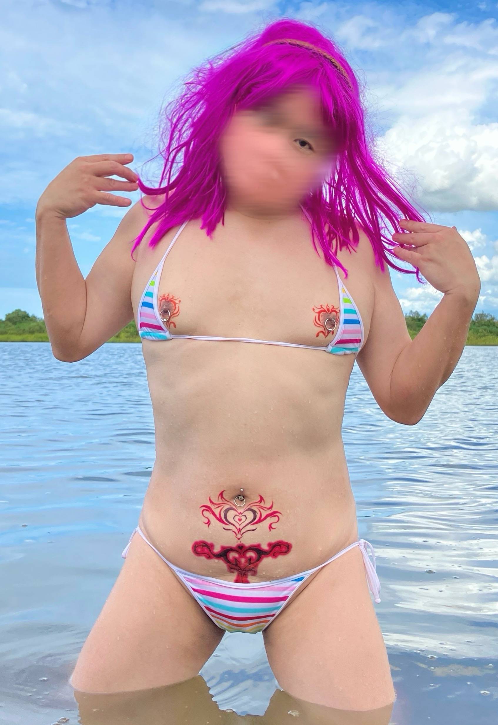 ボーダー柄の超極小サイズのマイクロビキニを身につけた女装子になって川で水遊びをしていたら気持ち良くなって淫紋とピアスが入った乳首を出しちゃいました(//∇//)