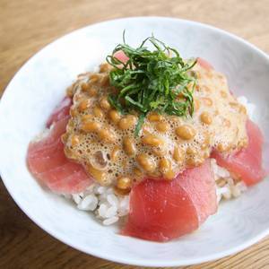 リュックさんは、「マグロ納豆丼」に「豆腐の味噌汁」。