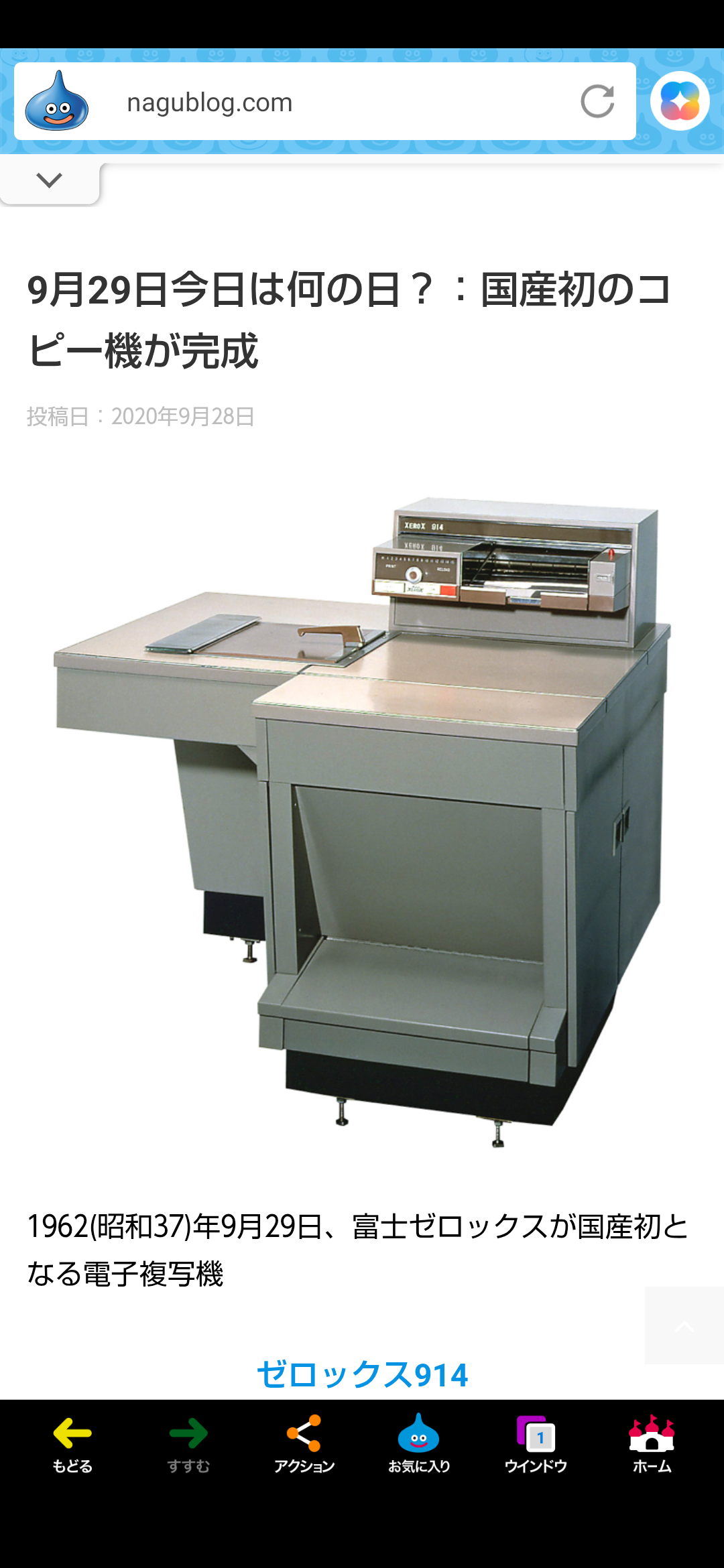 「1962年(昭和37年)富士ゼロックスが初の国産電子複写機(ゼロックスFX914)を完成した日」。🎌