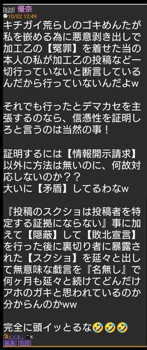 優奈氏に加工乙の濡れ衣を着せた事を告白して自ら【犯罪者】で有る事を認めて【敗北宣言】を出して負け犬で有る事を認めている