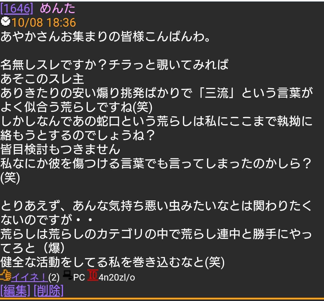 悪質な発狂コメントを繰り返す幼稚な荒らしのめんたは遂にあやか氏に愛想を尽かされたか🤣