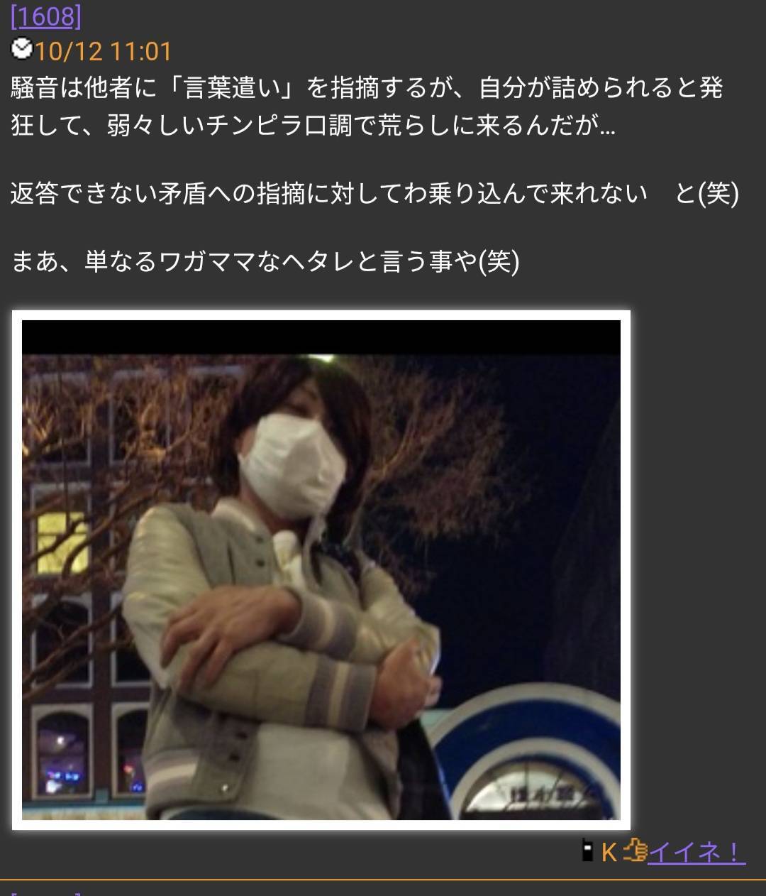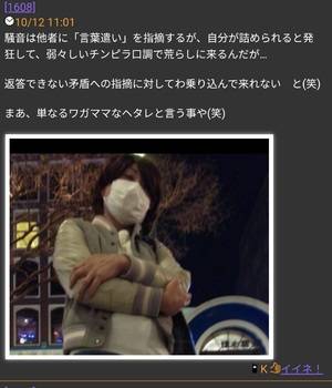 騒音は他者に「言葉遣い」を指摘するが、自分が詰められると発狂して、弱々しいチンピラ口調で荒らしに来るんだが…