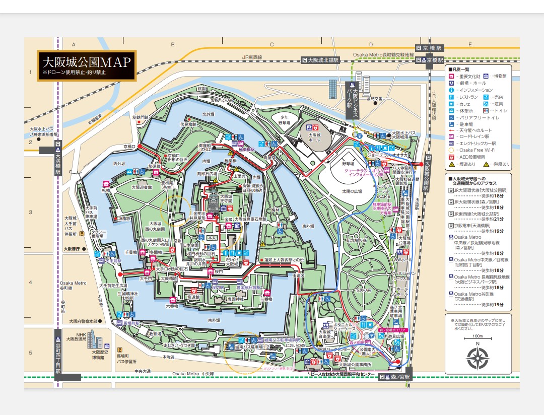 私が大阪城公園に行く時はJRの環状線、大阪城公園駅か森ノ宮駅のどちらかで降りて、大阪城公園の東側を中心に散策してました😊