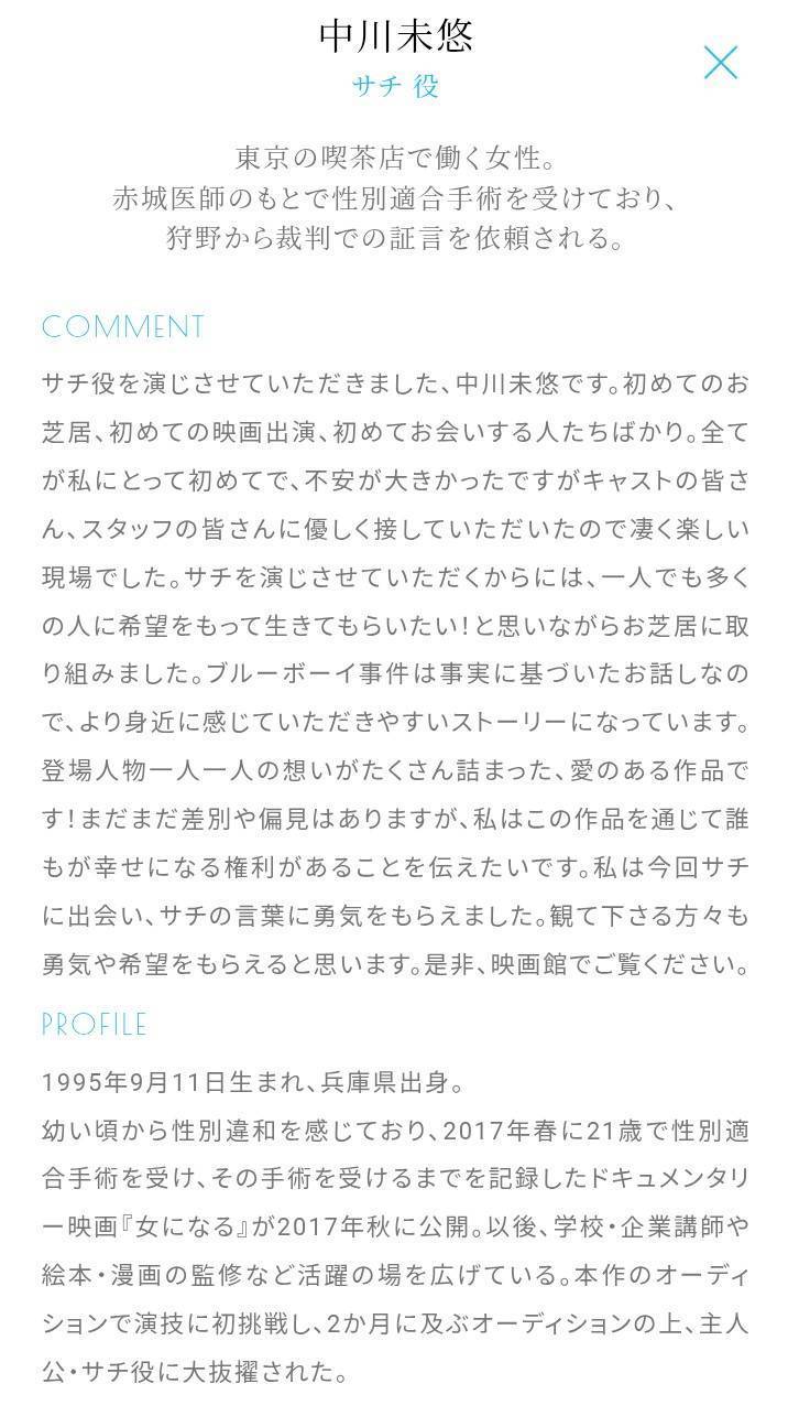 中川未悠さん主演の実話の映画『ブルーボーイ事件』が11/14封切に決定で、上映映画館もロードショー上映映画…全文