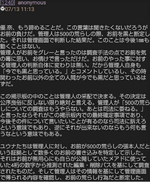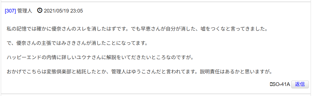 みさきさんが優奈のスレを消したと主張してるがこれは管理人がゆうこさんなのが前提なのに優奈はこれを証明できてない