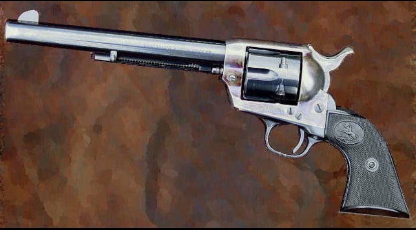 「コルトピースメーカー」とは懐かしいですね。西部劇でよく見る拳銃。それにしても、銃身が長い拳銃ですよね。(笑)