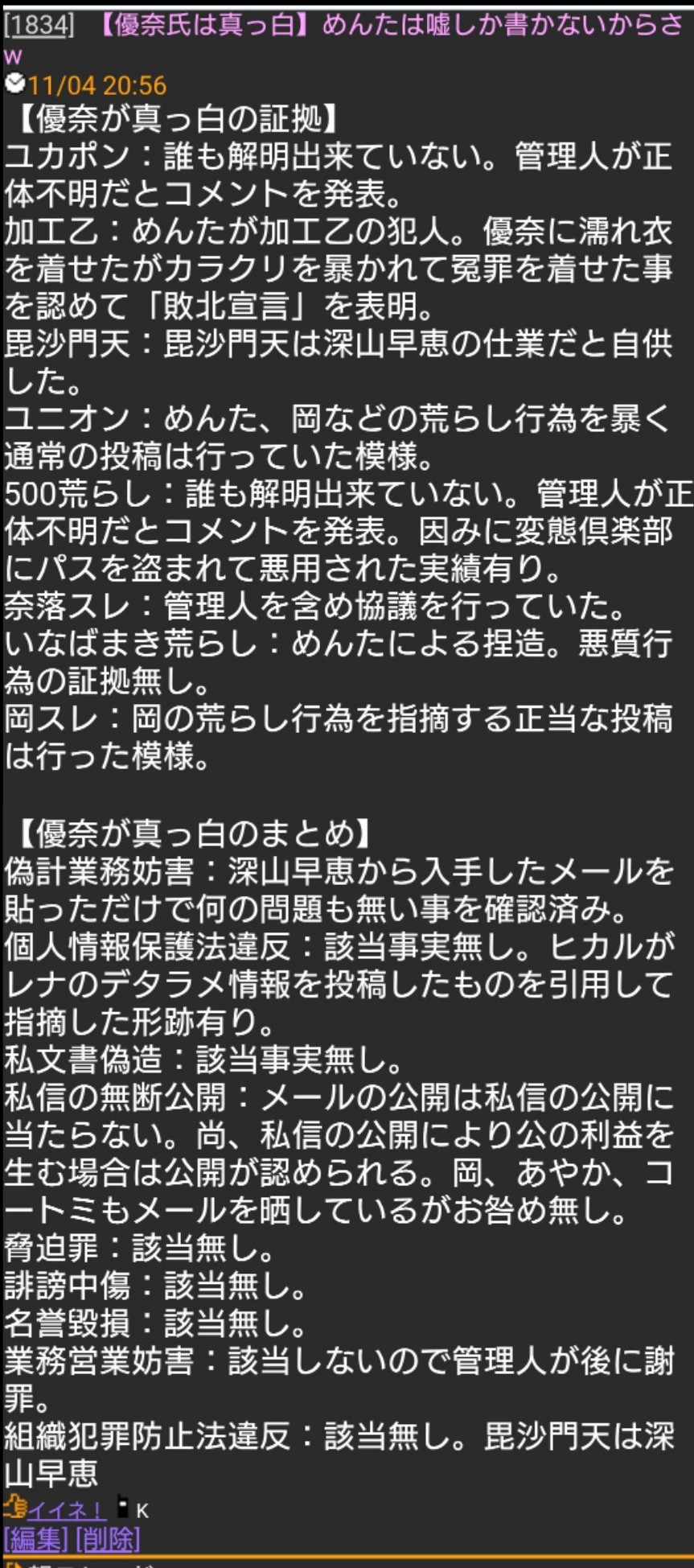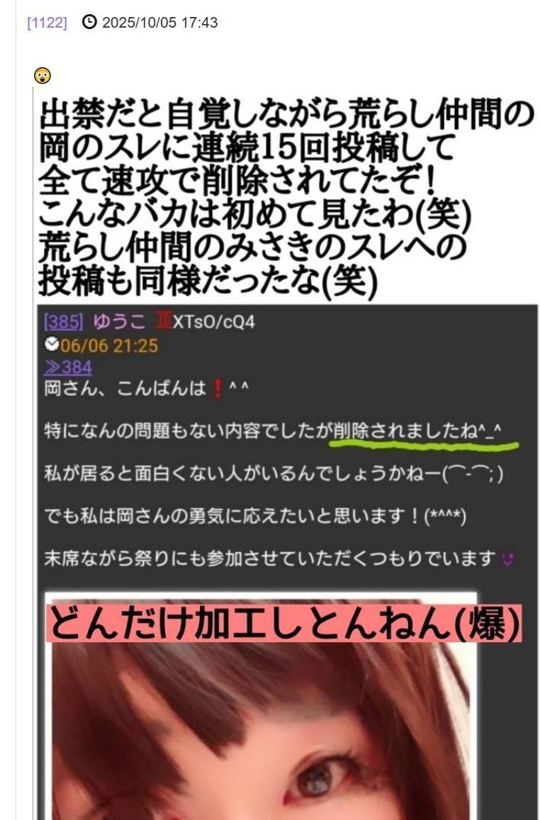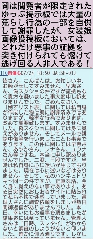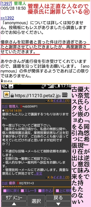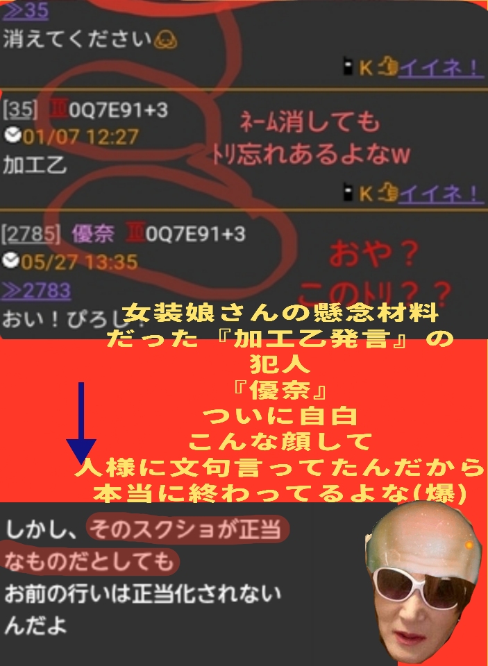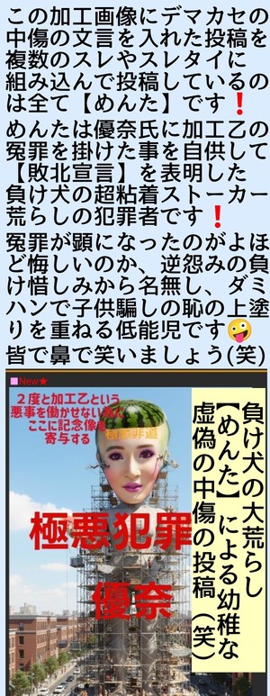 優奈の悪事なんて加工乙で敗北しためんたが悔し紛れで何の証拠も挙げずに勝手に話を作って並べて誹謗中傷しているだけのアホの戯言やもんな