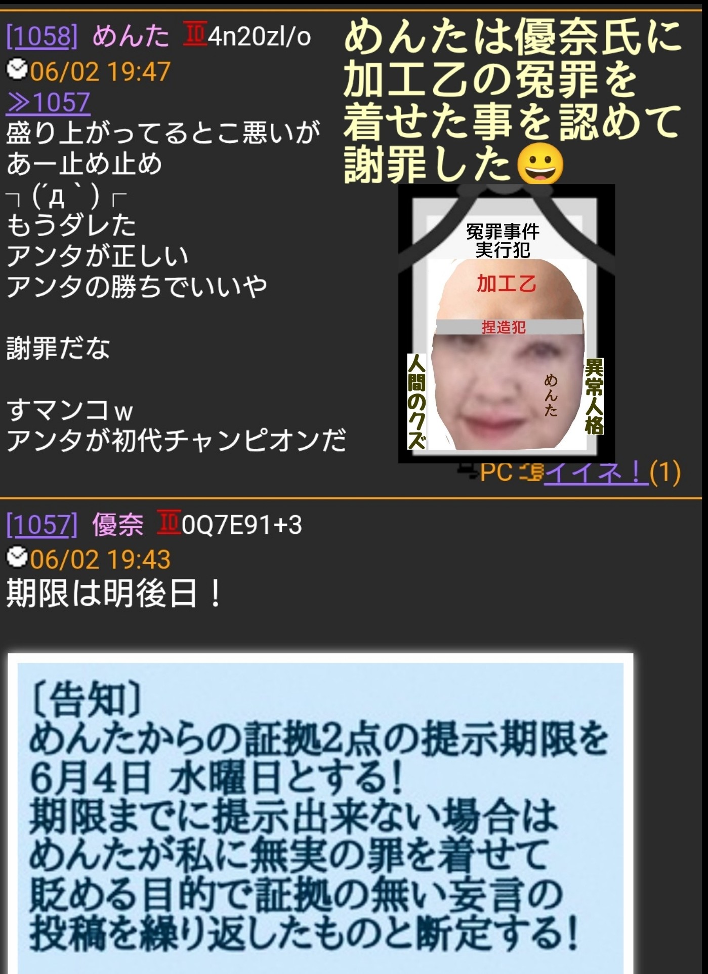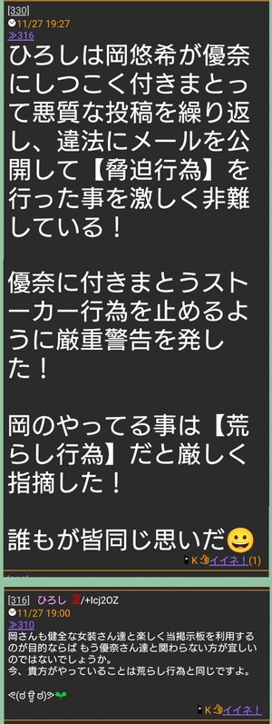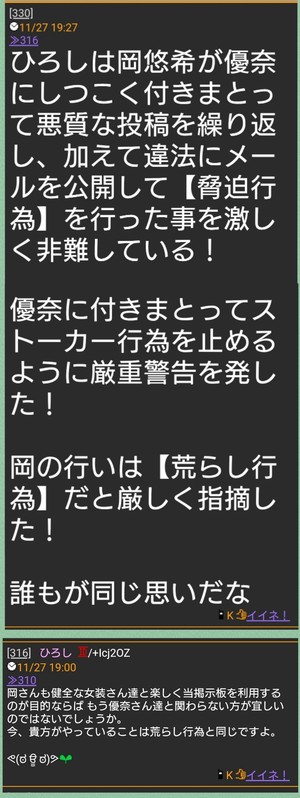 岡は数ヶ月前から優奈のスレや他スレで優奈に付きまとって何度も『腹を割って話をしよう』と迫っていた!